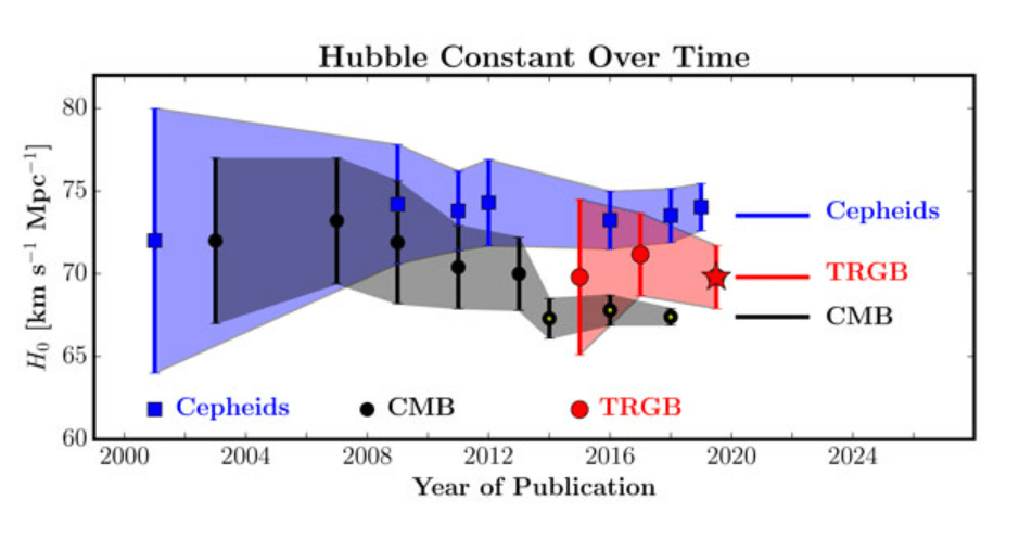 Over the years, the use of red giants has provided increasingly precise distance measurements. Initially, the method was less accurate due to challenges in identifying the TRGB point and calibrating its absolute magnitude. However, advancements in telescopic resolution and data analysis have led to more refined measurements, improving our understanding of cosmic distances. Yet, a problem persists: using TRGB yields a value of H0 of 67.4 ± 1.9 km/s/Mpc. This result, when considered on its own, appears to be in agreement with both CMB measurements and nearby standard candles.