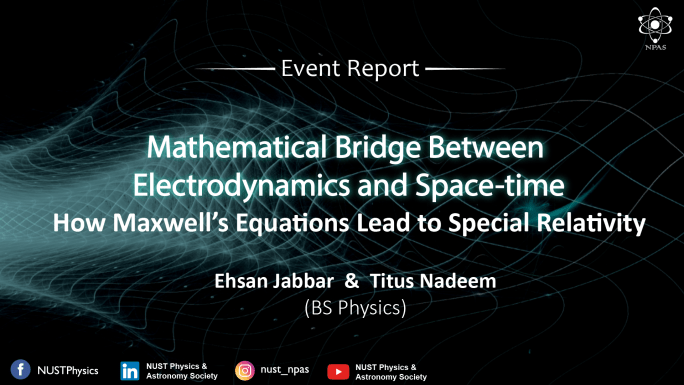 By Talha Mustafa and Musawwir Ahmed (Team Publications) The talk consisted of Mechanical Formalism and its incompatibility with certain concepts in Physics , Principle of Relativity, and different transformations relating two inertial frames of reference. History and discoveries in Electrostatics and Electromagnetism were briefly spelled out mentioning the craziest stories of all great minds in … Continue reading Mathematical Bridge Between Electrodynamics and Spacetime | Physics Talks